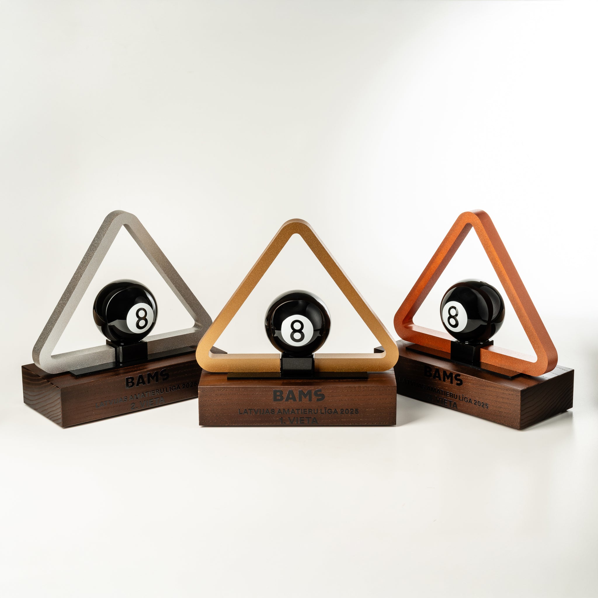 These specially designed billiards awards are created with a unique and thematic design that features characteristic billiards elements. The shape of the trophy is inspired by the geometry of a billiards table, while the central accent – a glass ball with the number “8” – symbolizes the climax of the game and victory.
